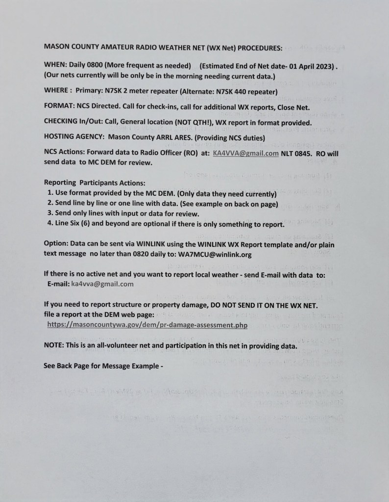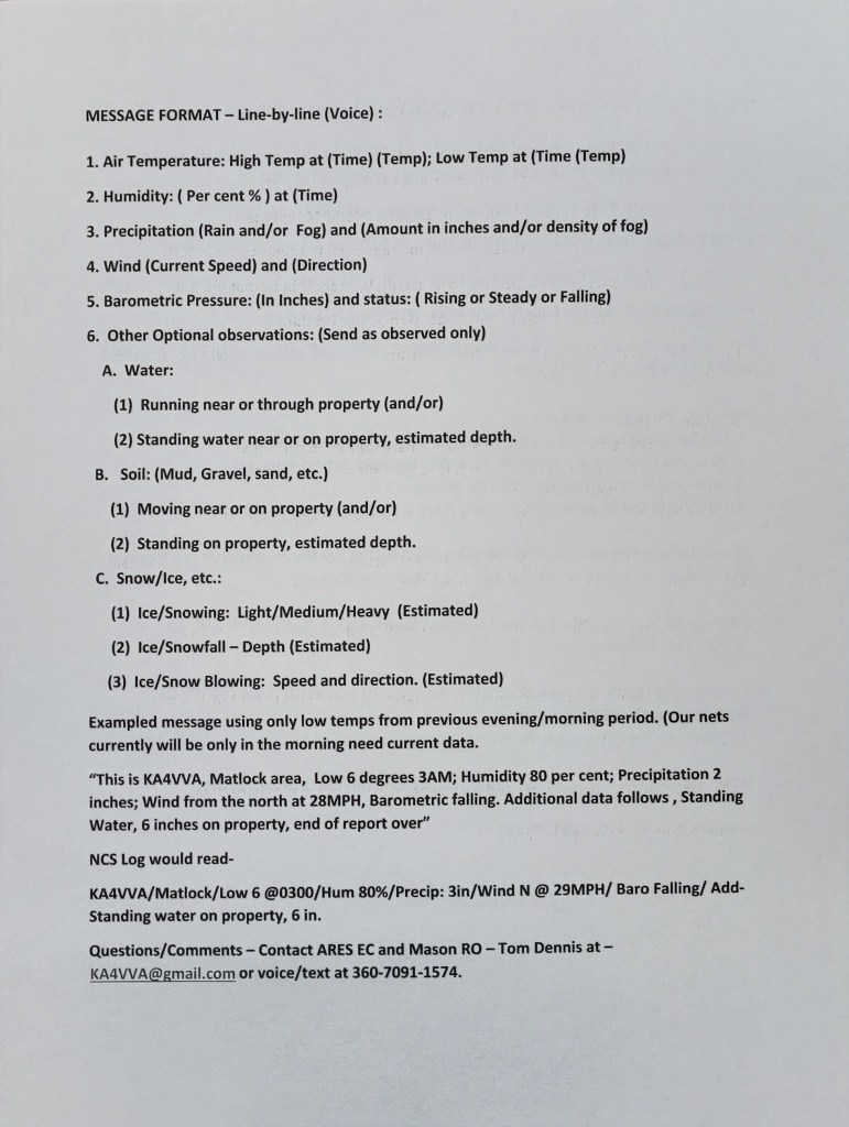 The preferred reporting format will include observations of temperature, humidity, wind, barometric pressure, water condition, soil, and snow and ice. Results will be forwarded to the Mason County Department of Emergency Management. DEM wants real “eyeball” accounts from hams around the county.
